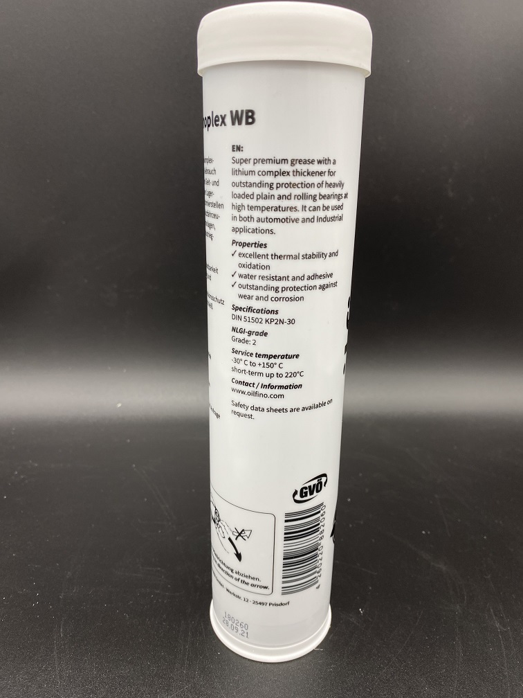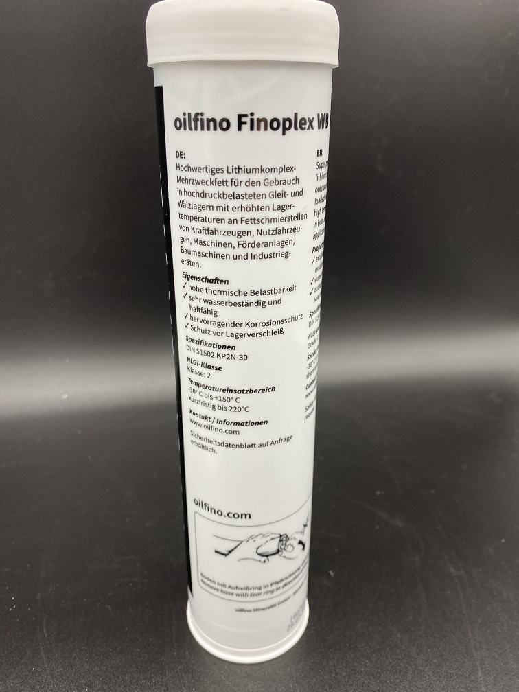 BESCHREIBUNG oilfino Finoplex WBist ein hochwertiges Lithiumkomplex Mehrzweckfett für den Gebrauch in hochdruckbelasteten Gleit- und Wälzlagern mit erhöhten Lagertemperaturen an Fettschmierstellen von Kraftfahrzeugen, Nutzfahrzeugen, Maschinen, Förderanlagen, Baumaschinen und Industriegeräten. Es ist besonders für die Radlagerschmierung von Nutzfahrzeugen und schnell laufenden PKW- Radlagern empfohlen.