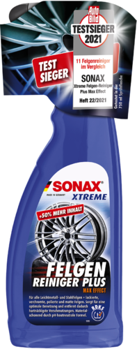 SONAX XTREME FelgenReiniger PLUS ist ein hochwirksamer, säurefreier Spezialreiniger für alle Stahl- und Leichtmetallfelgen – auch verchromte und polierte Felgen. Er entfernt schnell und mühelos selbst hartnäckigste Verschmutzungen wie eingebrannten Bremsstaub, Öl- und Gummirückstände sowie sonstige Straßen-verschmutzungen.