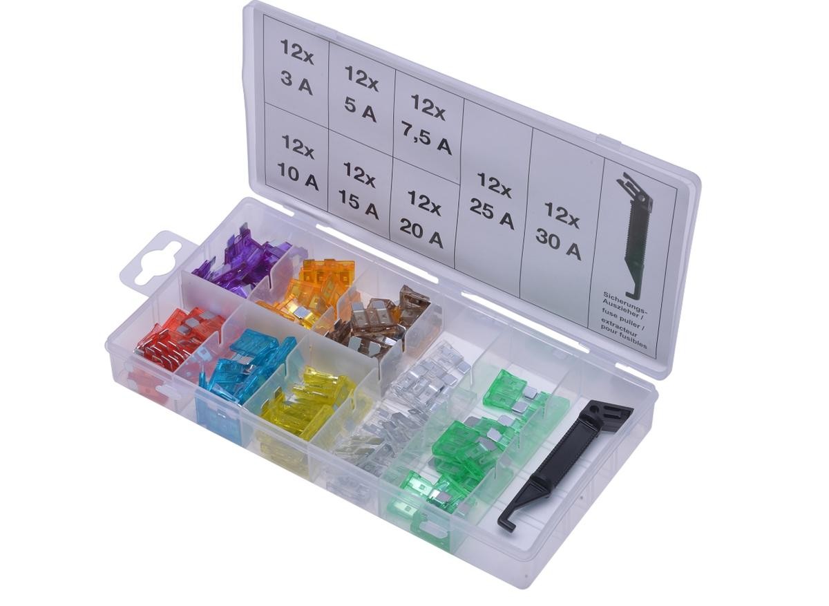 Sicherungs-Sortiment, 97-teilig - Je 12 Stück Midi FK2 - farblich gekennzeichnet - 3 - 5 - 7,5 - 10 - 15 - 20 - 25 - 30 Ampere - 1 Sicherungs-Auszieher